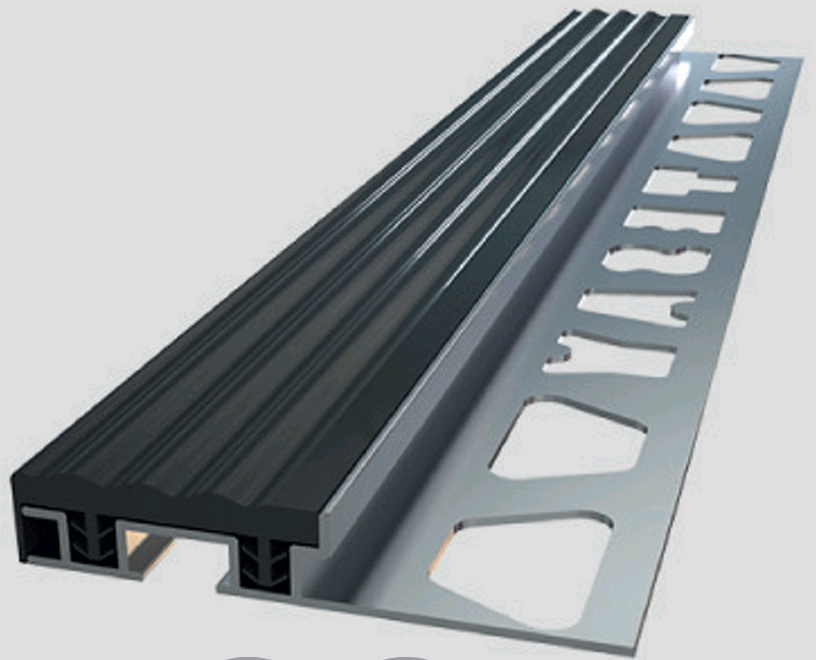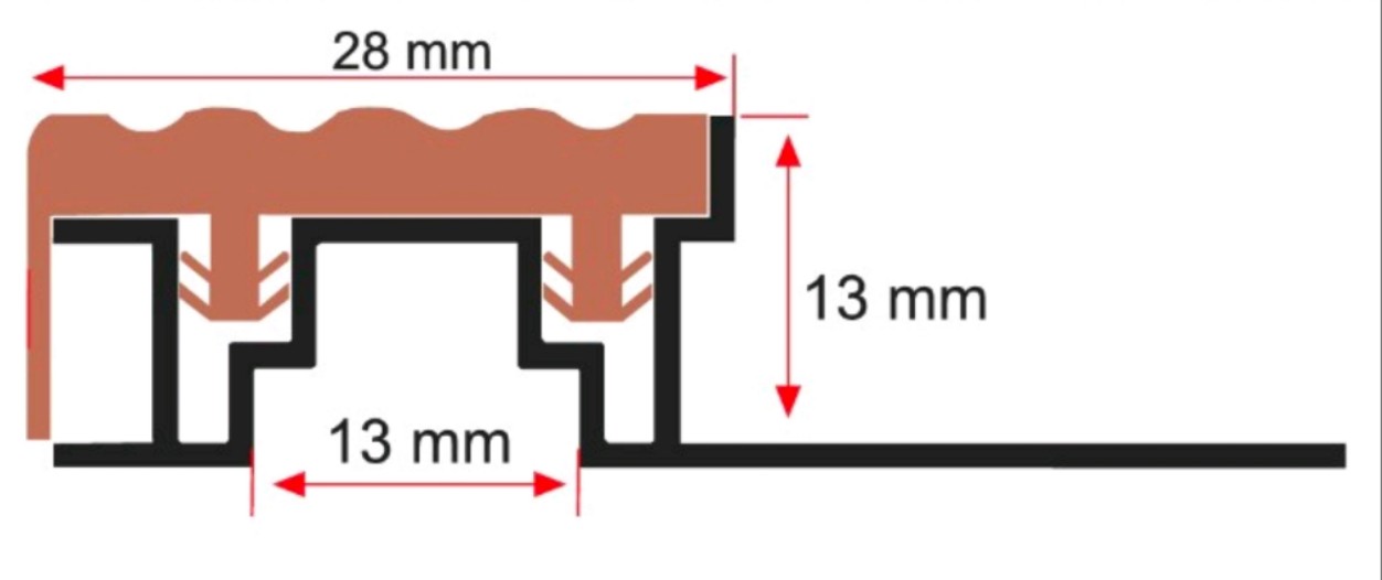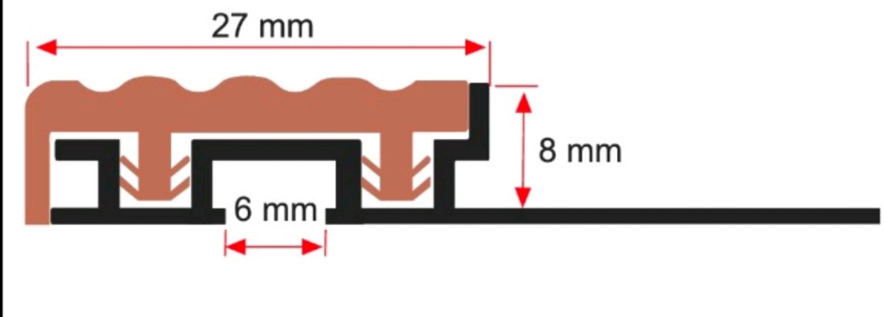 Profil aluminiowy wykończony z wierzchu tworzywem PVC. Konstrukcja zezwala na zamontowanie listwy na stopniach wykończonych płytkami ceramicznymi. Gwarantuje bezpieczeństwo przed uszkodzeniami.